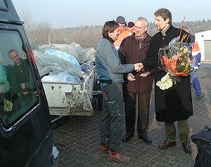 ![]() Herr Dr. Herbert Engel, Leiter des Geschäftsbereichs Abfallwirtschaft / Stadt Wolfsburg (rechts) und Herr Werner Borcherding, Bau- und Umweltdezernent Stadt Wolfsburg (mitte), begrüßen den ersten "Kleinanlieferer"